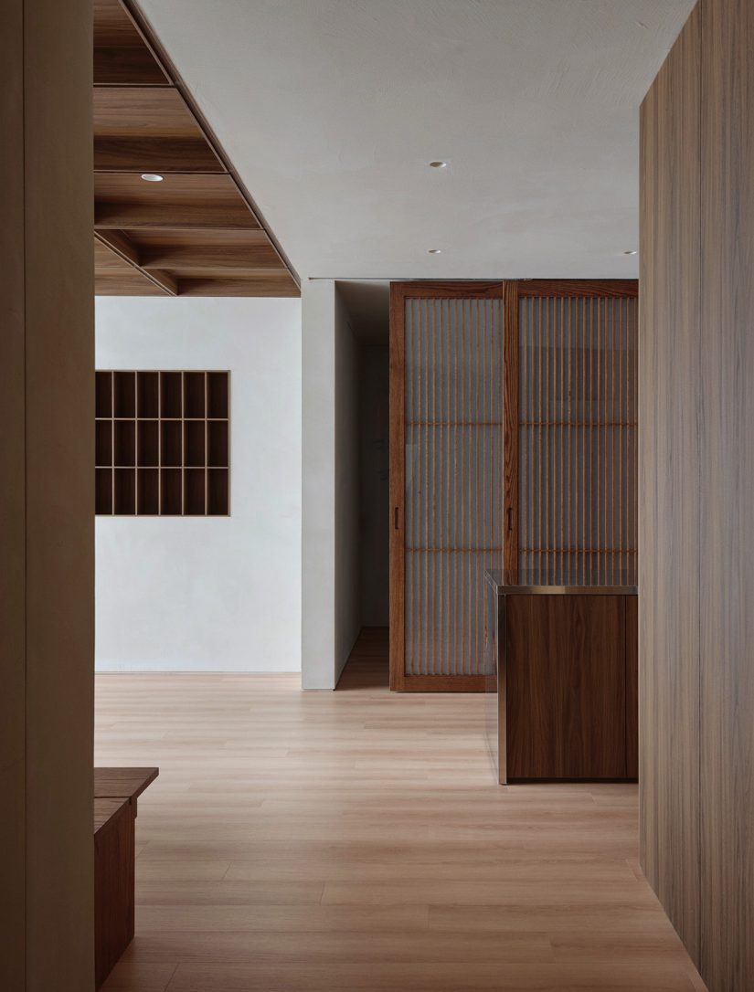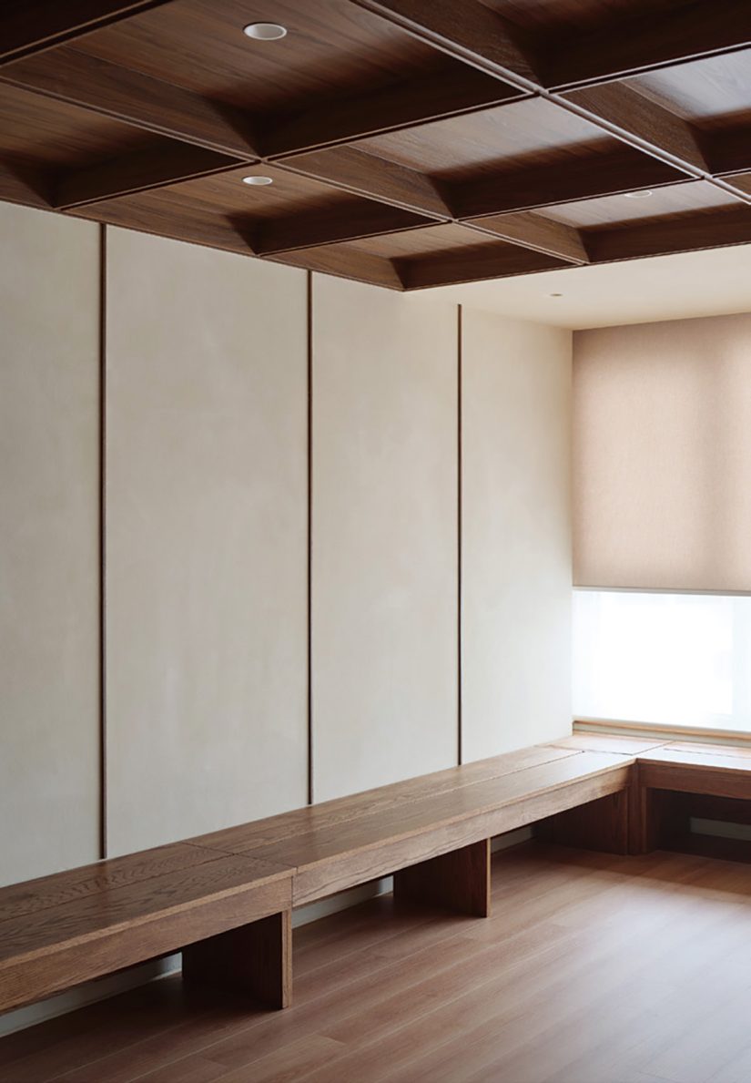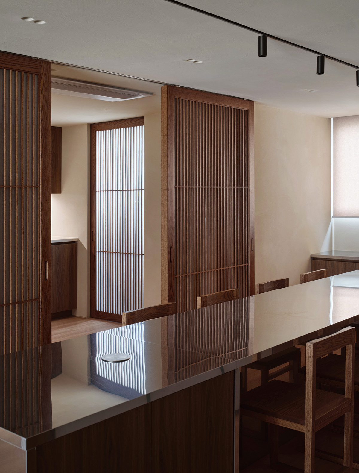 박종성 조근호 변호사님은 첫 만남부터 의도가 명확하셨습니다. 되레 처음에는 제가 주거라는 틀에 갇혀 있었죠. 그때 절대공간에 대한 자세한 이야기를 들었고, 두 번째 미팅에서는 제가 그 개념을 확실히 이해했음을 새로운 시안으로 보여드렸습니다. 먼저 와비사비를 제 방식대로 재해석했습니다. 와비의 소박함은 덜어냄으로, 사비의 오래된 멋은 소재로요. 그래서 공간에 곡선을 포함한 모든 장식적 요소를 배제했습니다. 극도의 깔끔함을 위해 모든 문에 돌출된 손잡이마저 없앴죠. 직선으로 정갈함을 극대화했다면, 마감재를 고를 때는 5년 후, 10년 후의 공간을 떠올렸습니다. 가죽이 에이징되듯 가구와 벽 모두 세월의 흔적을 격조 있게 담아낼 원목 같은 소재를 사용해, 시간의 흐름에 따라 낡아가는 공간이 아닌 익어가는 공간을 의도했습니다.