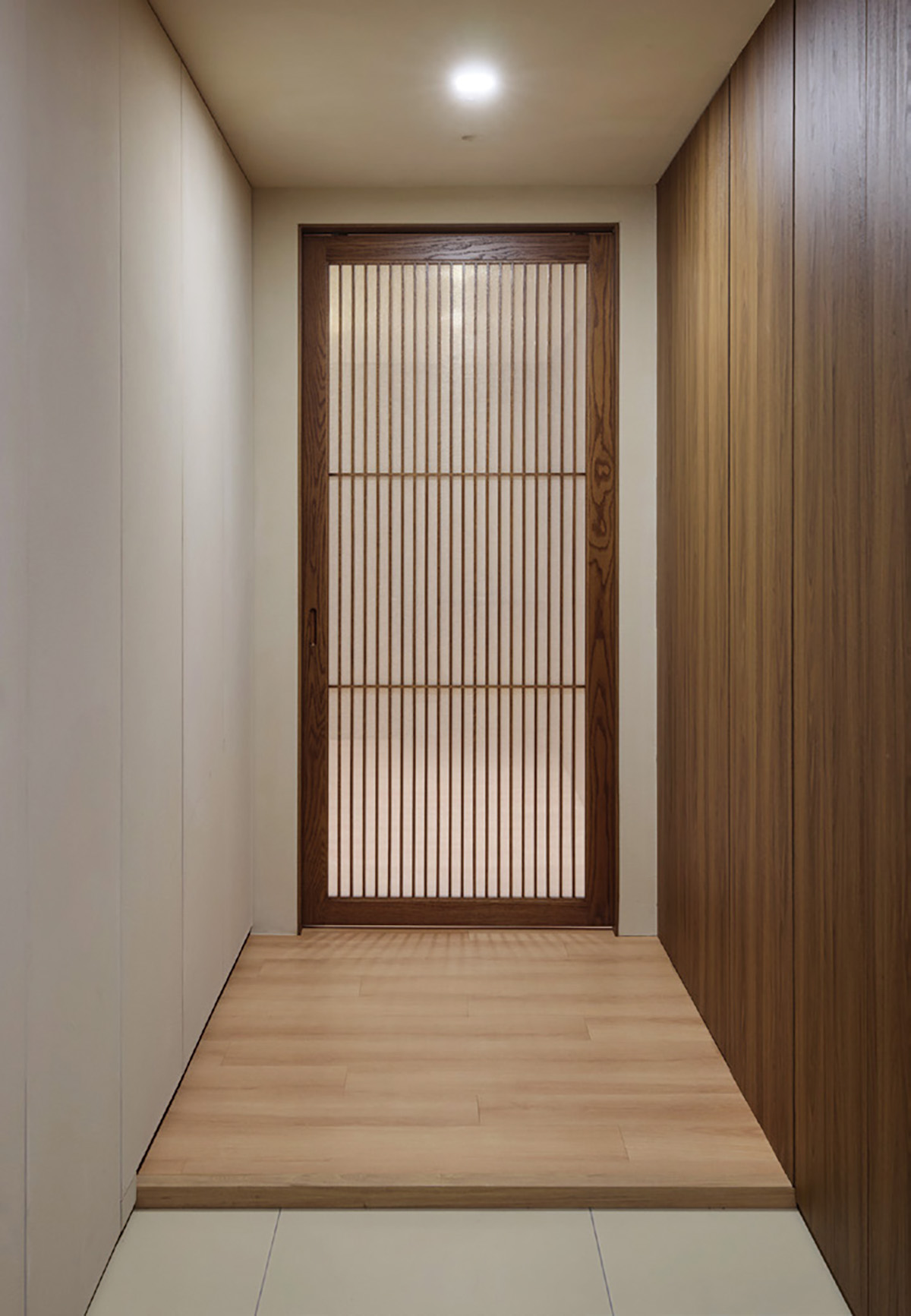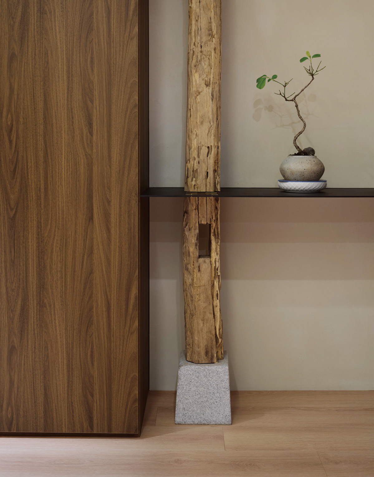 박종성 조근호 변호사님은 첫 만남부터 의도가 명확하셨습니다. 되레 처음에는 제가 주거라는 틀에 갇혀 있었죠. 그때 절대공간에 대한 자세한 이야기를 들었고, 두 번째 미팅에서는 제가 그 개념을 확실히 이해했음을 새로운 시안으로 보여드렸습니다. 먼저 와비사비를 제 방식대로 재해석했습니다. 와비의 소박함은 덜어냄으로, 사비의 오래된 멋은 소재로요. 그래서 공간에 곡선을 포함한 모든 장식적 요소를 배제했습니다. 극도의 깔끔함을 위해 모든 문에 돌출된 손잡이마저 없앴죠. 직선으로 정갈함을 극대화했다면, 마감재를 고를 때는 5년 후, 10년 후의 공간을 떠올렸습니다. 가죽이 에이징되듯 가구와 벽 모두 세월의 흔적을 격조 있게 담아낼 원목 같은 소재를 사용해, 시간의 흐름에 따라 낡아가는 공간이 아닌 익어가는 공간을 의도했습니다.