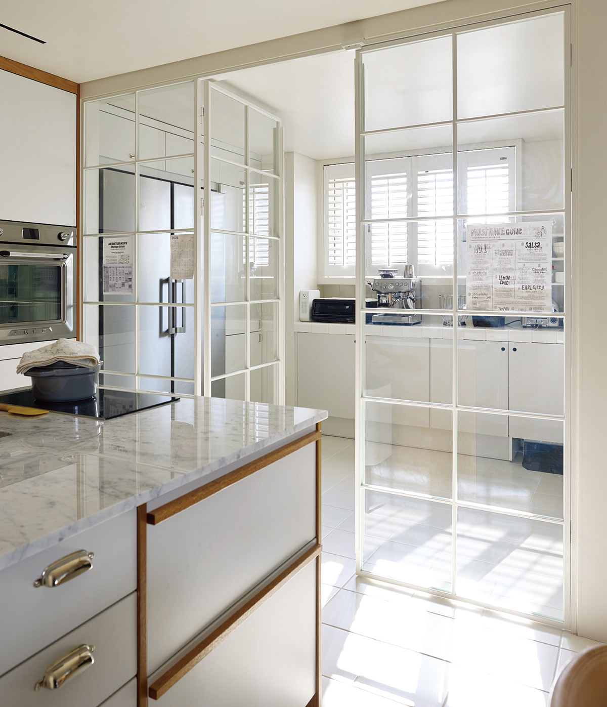 “공간이 탁 트여 있는데도 뭔가 시원하지 않고 썰렁하게 느껴질 때가 있어요. 이럴 때 적절한 구성이 필요합니다. 가족의 생활에 맞춘 면적을 만드는 것이 인테리어의 첫 번째 단계인데, 이번 프로젝트에서는 특히 주방에 신경 썼어요. 생각해보면 주방과 다이닝은 집에서 가장 자주 오가고 여러 행위가 이루어지는 곳이에요. 요리와 설거지 및 식기를 보관하는 메인 주방, 가족이 식사하는 다이닝, 냉장고와 커피 머신 등 주방 가전을 모두 모은 존으로 용도를 분명하게 구분해 각자의 동선이 뒤섞이지 않고 쾌적하게 쓸 수 있도록 했어요. 가전은 소재와 색감이 천차만별이라 한데 모아서 분리하는 것이 미적으로도 좋습니다.”