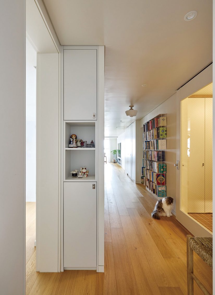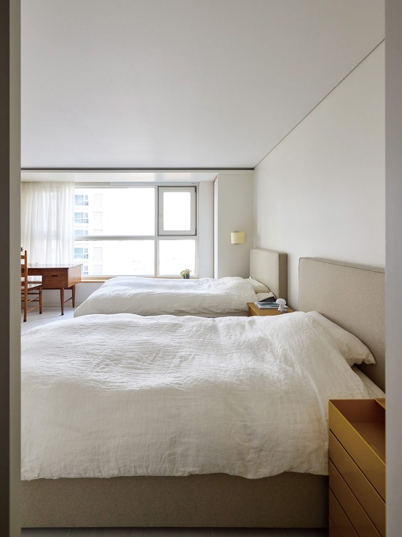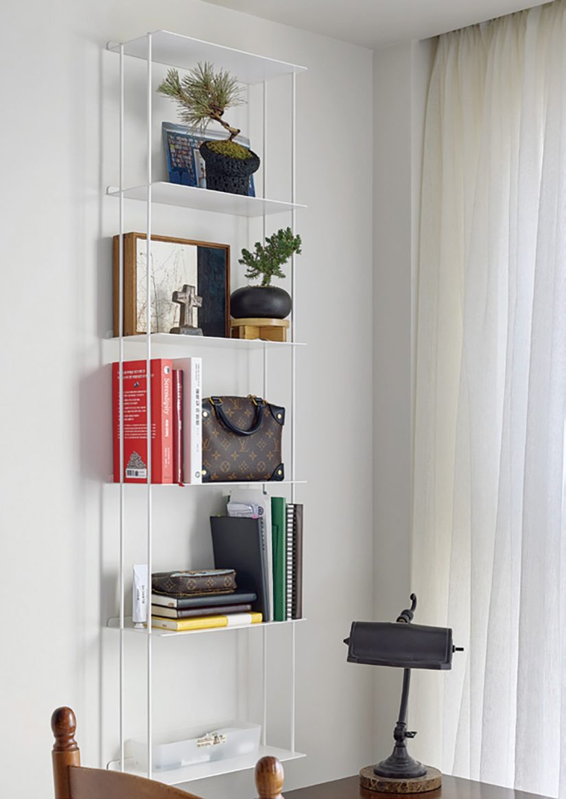 이번에도 심희진 대표는 옷을 수선하듯 공간을 재단하며 살기에도, 보기에도 좋은 배경을 만들었다. 복도는 벽을 원래보다 20cm 정도 안쪽으로 들여 일부러 공간을 줄이고 수납장과 얇은 책꽂이를 더했다. 주방은 맥없이 흩뿌려져 있던 영역을 세 가지로 구분해 짜임새를 갖췄다. 안방을 좁히고 만든 수납장, 아들 방의 프라이버시를 위해 설치한 벽, 딸 방에서 영역을 구분하는 벽도 모두 디자이너가 새롭게 더한 요소다.