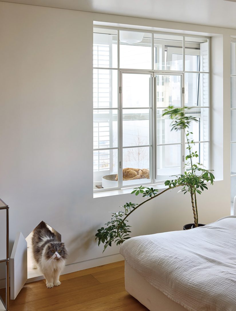 창 크기를 조절해 탄생한 주택 같은 거실도 디자이너의 솔루션. 건너편 아파트가 보이는 곳은 과감히 막고, 가장 적절한 한강 뷰에 맞 춰 창 크기를 재설정했다. 멀쩡한 창을 막는다고 하면 본능적으로 우려가 들지만, 어떻게 막는지에 따라 달라진다. 전형적인 아파트 슬라이딩 창호 대신 사용한 격자창과 갤러리창은 아파트를 주택 같은 분위기로 만들어준다. 갤러리창은 차폐를 조절하고, 격자창의 그리드는 공간의 시각적 밀도를 채워주는 효과도 있다. 그 결과 격자창 너머 햇볕이 가장 잘 드는 곳에 탄생한 고양이 존에서는 낮이면 반려 고양이 두 마리가 햇빛을 받으며 한가로이 졸거나 바깥 풍경을 바라보는 모습을 볼 수 있다.