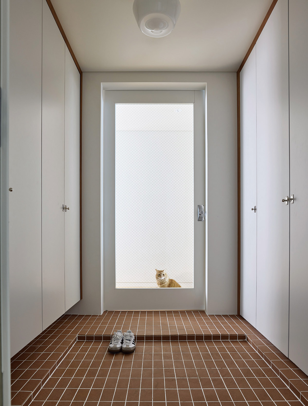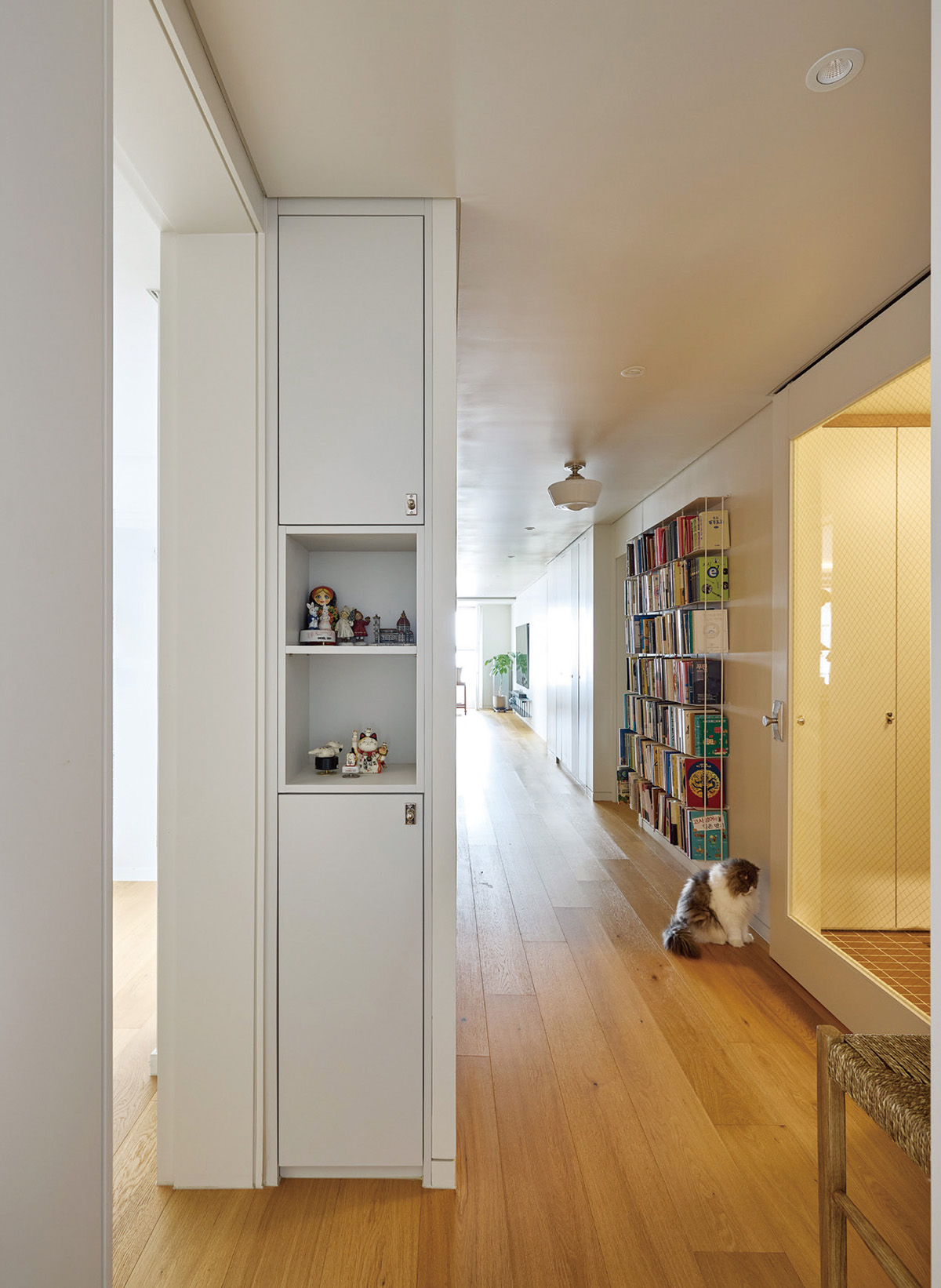 창 크기를 조절해 탄생한 주택 같은 거실도 디자이너의 솔루션. 건너편 아파트가 보이는 곳은 과감히 막고, 가장 적절한 한강 뷰에 맞 춰 창 크기를 재설정했다. 멀쩡한 창을 막는다고 하면 본능적으로 우려가 들지만, 어떻게 막는지에 따라 달라진다. 전형적인 아파트 슬라이딩 창호 대신 사용한 격자창과 갤러리창은 아파트를 주택 같은 분위기로 만들어준다. 갤러리창은 차폐를 조절하고, 격자창의 그리드는 공간의 시각적 밀도를 채워주는 효과도 있다. 그 결과 격자창 너머 햇볕이 가장 잘 드는 곳에 탄생한 고양이 존에서는 낮이면 반려 고양이 두 마리가 햇빛을 받으며 한가로이 졸거나 바깥 풍경을 바라보는 모습을 볼 수 있다.